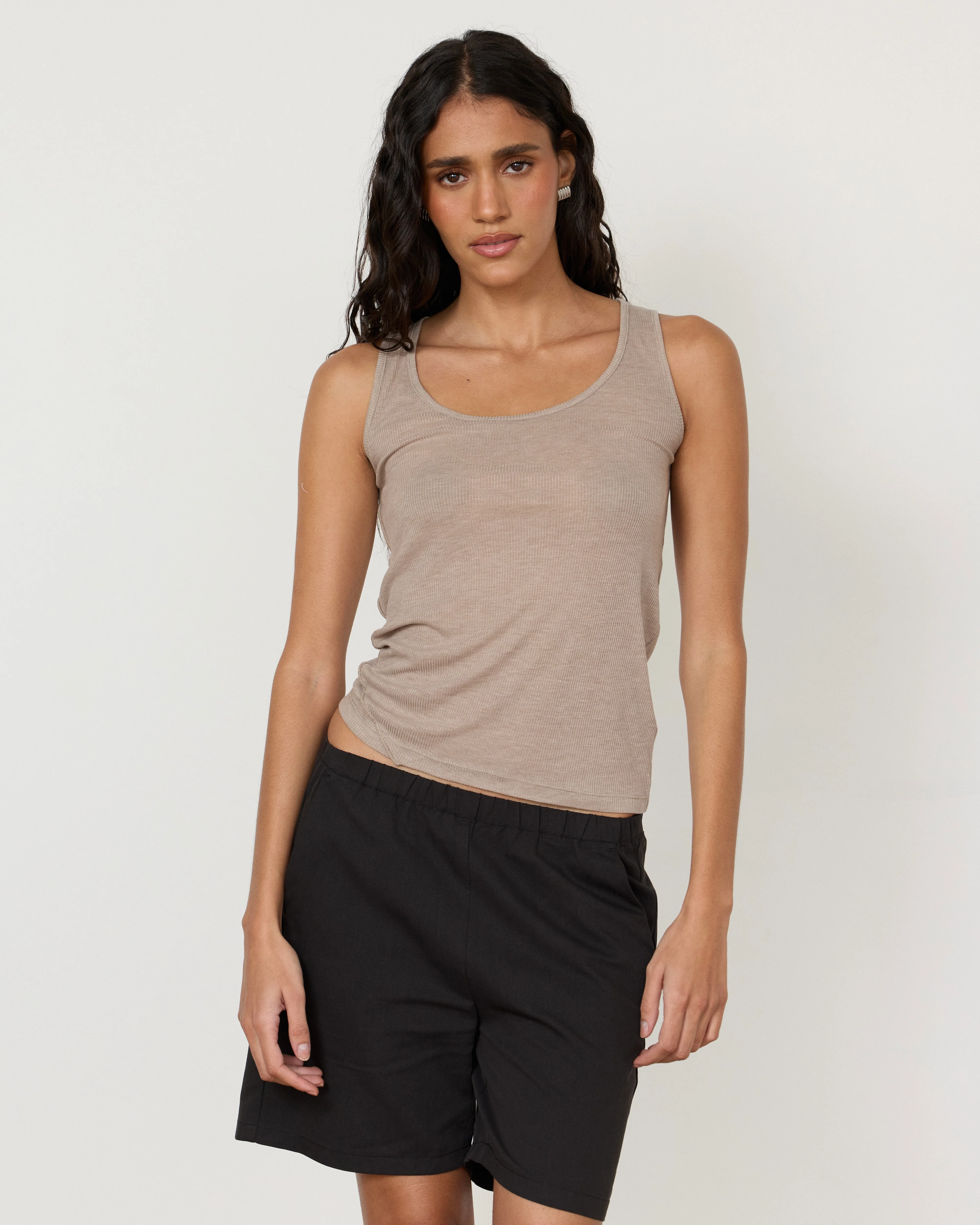 The Benny Top is a semi-sheer, lightly ribbed tank designed for easy layering. Soft, fluid, and weightless, it features a close-to-the-body fit that feels effortless. Wear it over a lace bralette or on its own for a clean, minimal look.